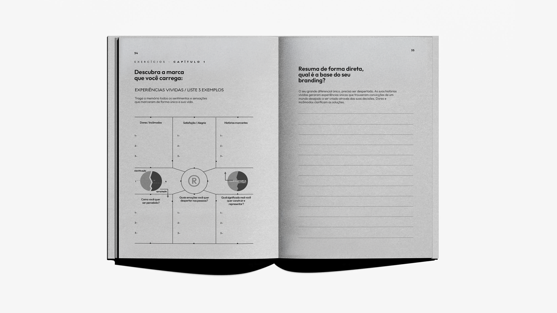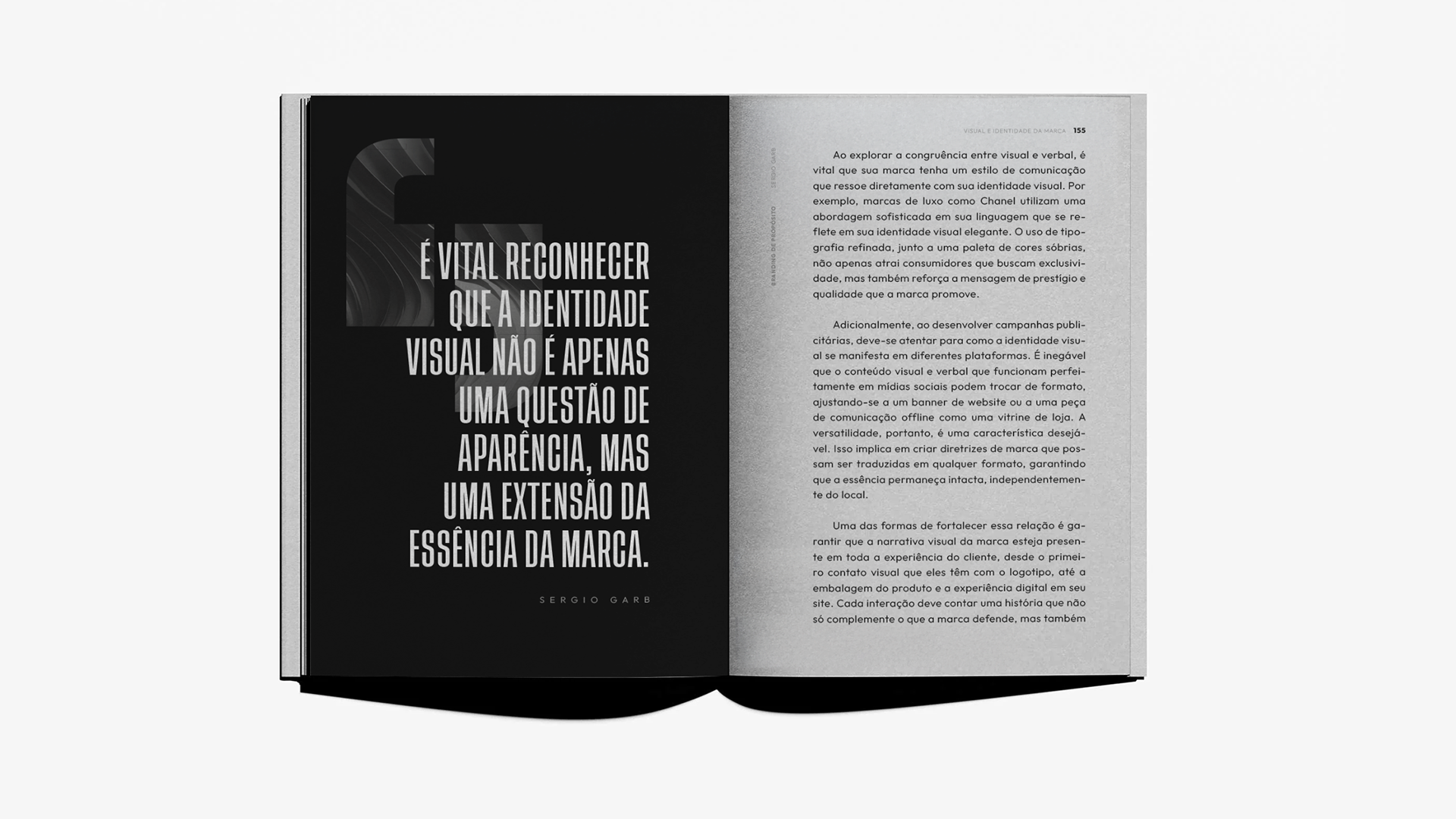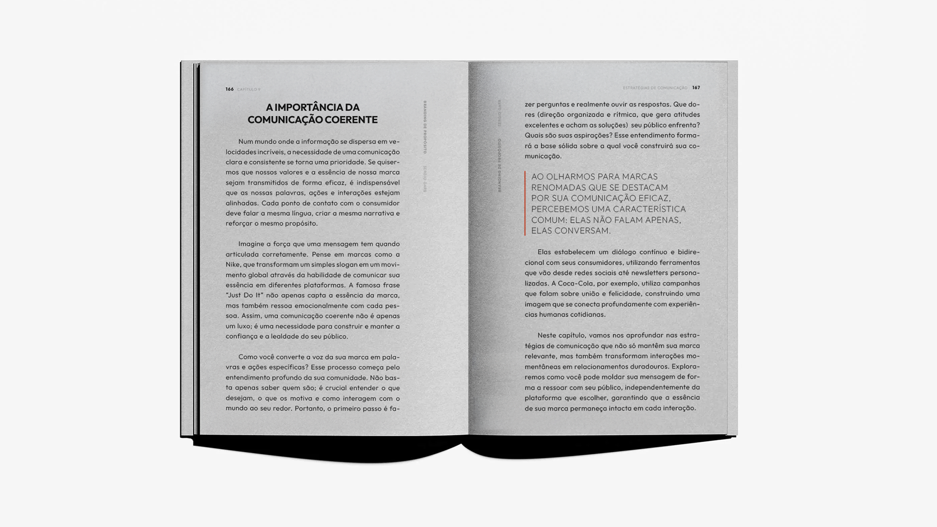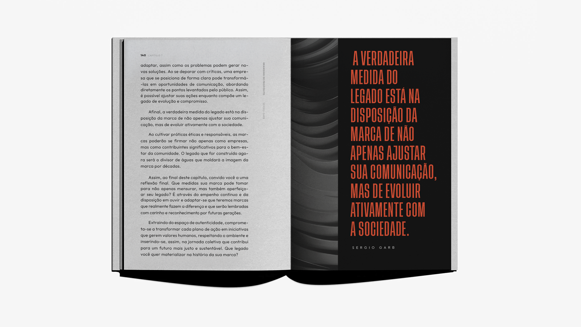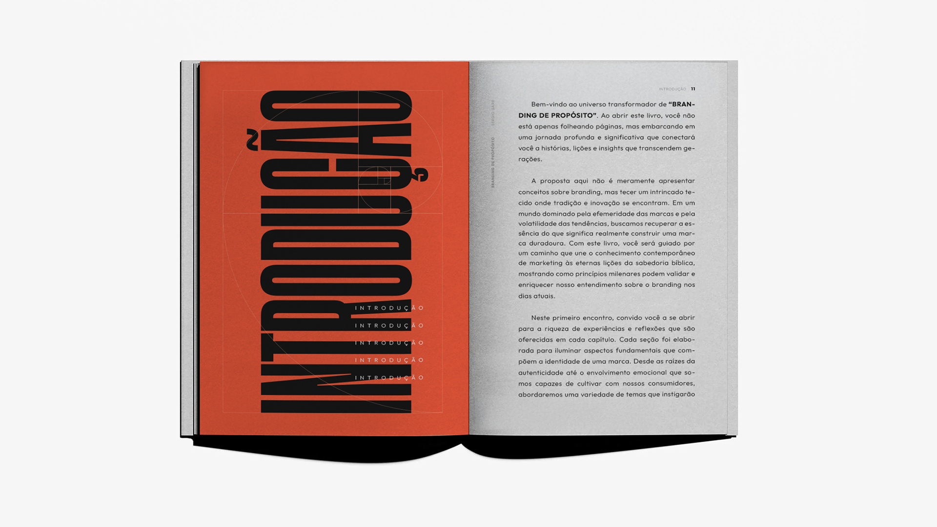 Projeto editorial de “Branding de Propósito”, com diagramação focada em clareza, contraste e hierarquia visual. Tipografia expressiva, uso estratégico do espaço e uma paleta sóbria constroem uma narrativa visual que reforça o conceito de marcas guiadas por propósito.